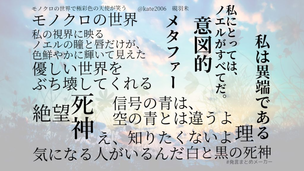 私は、死神だ。死神は標的以外の色を認識しない。する必要がないからだ。モノクロの世界が優しいのは、本当は誰の命も奪いたくはないからに他ならない。私は異端である。