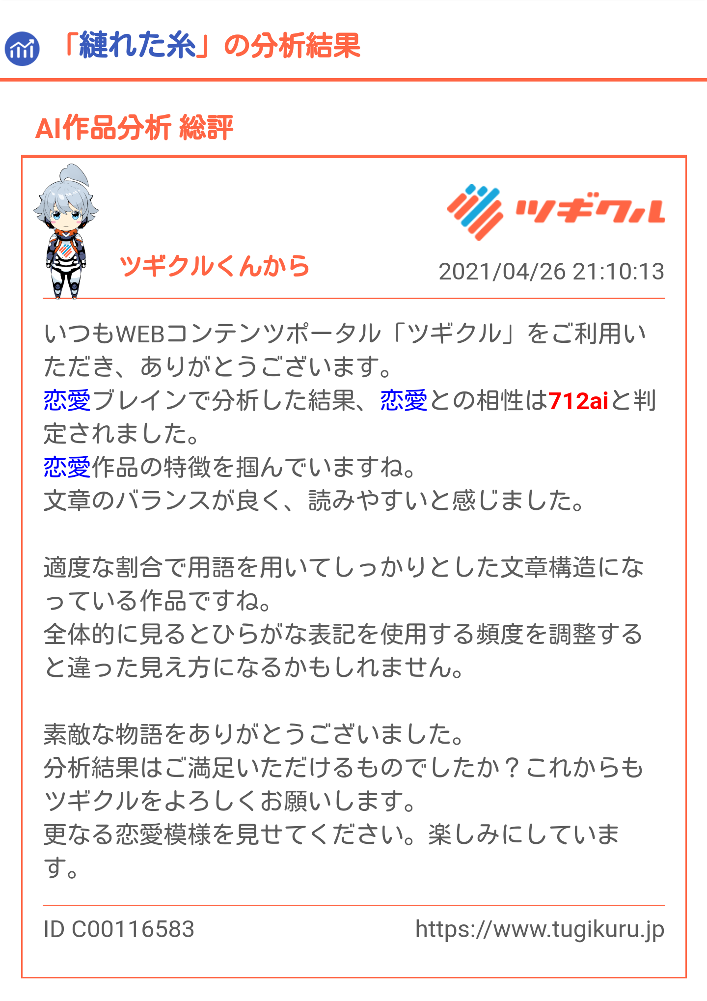 ツギクルさんにはAIによる作品分析をしてくれるサービスがあります。(2021年7月現在)